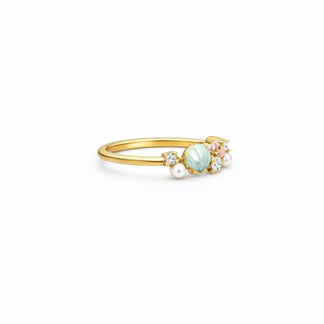 Charming ocean-inspired ring in S925 sterling silver with warm gold plating, enamel seashell detail, tiny pearl accents, and delicate floral motifs. A playful stackable piece that mixes color, texture, and sparkle , ideal for summer styling or layered looks. Comfortable for everyday wear.